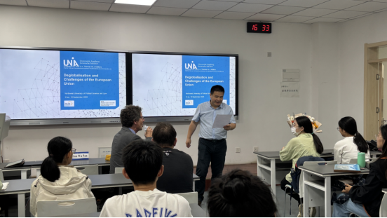 讲座伊始,潘俊武院长对Thomas Möllers教授的到来表示热烈欢迎,并简要介绍其学术背景与研究领域,强调在当前国际形势下,探讨欧盟面临的去全球化等挑战对涉外法治人才培养的重要意义,为讲座拉开序幕。