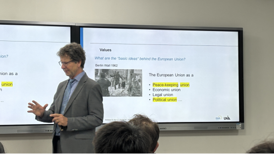Thomas Möllers教授从欧盟一体化历史切入,梳理了从1951年《巴黎条约》到2009年《里斯本条约》的关键节点,强调欧盟作为“和平联盟”“经济联盟”与“法律联盟”的多重属性。关于欧盟制度架构,默勒斯教授详细解析了欧盟理事会、欧洲议会、欧盟委员会等七大机构的职能分工,并以欧洲议会“共同决策程序”为例,说明成员国与超国家机构的立法权力平衡。此外,以“去全球化”为核心切入点,结合近年国际政治经济格局变化,系统分析了该趋势对欧盟的多重影响。他指出,近年来英国脱欧、新冠疫情、地缘政治冲突等多重因素加速了去全球化进程,这对以多边主义为基础的欧盟带来了前所未有的挑战。教授特别强调,尽管面临重重挑战,但经济全球化仍是未来发展之潮流。