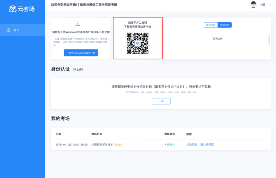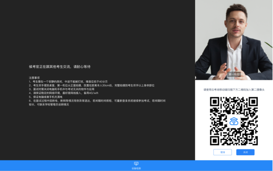 e. 若当考试要求使用双摄像头进行面试时,考生需要打开云考场移动端扫描该页面提供的二维码加入第二摄像头。考生须将手机屏幕锁定设置成“永不”,避免考试期间因手机锁屏造成第二摄像头无法提供视频画面的情况
