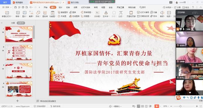 为深入学习贯彻习近平总书记五四寄语精神,引领毕业生党员更好地明确责任担当,传承“西迁精神”,5月27日,英超直播线上看 2017级研究生党支部以线上方式开展主题党日活动。支部全体党员参加活动,支部书记王珊珊主持活动。
