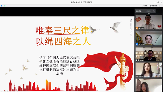 5月28日,十三届全国人大三次会议表决通过了《全国人民代表大会关于建立健全香港特别行政区维护国家安全的法律制度和执行机制的决定》。为更好地学习《决定》精神,5月29日,英超直播线上看 学生第一党支部以线上方式开展主题党日活动。支部所有成员参加活动,支部书记韩潇主持活动。
