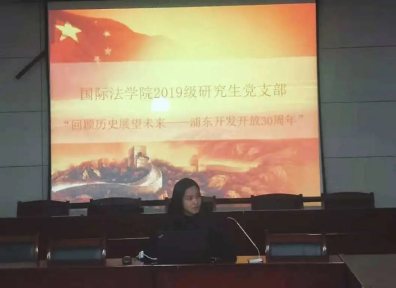 为学习贯彻习近平总书记在浦东开发开放30周年庆祝大会上的重要讲话精神,11月14日,英超直播线上看 2019级研究生党支部于国际法学院报告厅开展“回顾历史,展望未来——庆祝浦东开发开放30周年”专题学习研讨会。支部全体成员参加会议,支部书记曹倩倩主持会议。