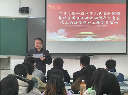 为深入学习贯彻习近平法治思想,落实总书记关于推进涉外法治人才培养的重要论述,引导支部成员关注世界大势,聚焦现实挑战,明确自身使命担当,11月8日,英超直播线上看 学生第二党支部于格物楼304教室专题学习习近平主席在中华人民共和国恢复联合国合法席位50周年纪念会议上的讲话精神。支部全体成员参加会议,会议由支部书记苏芝双主持。