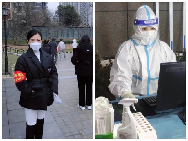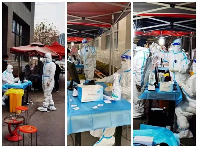 接下来的几天,张毓慧同志不仅是一个“小红”,还成为了“大白”,协助医务人员进行现场核对和录入检测者信息以及更换检测试管。该项工作强度虽然不小,但最让她感到挑战的是手部刺骨的寒冷,尤其是每次用冰冷的消毒液进行手部消毒时,更是明显。每次工作结束,脱防护衣时,手都已经僵硬地快没有了知觉,但她依旧坚定值守。