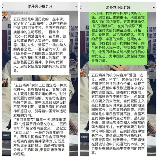 活动伊始,潘或越领学了习近平总书记在庆祝中国共产主义青年团成立100周年大会上的重要讲话和国务院新闻办公室4月21日发表的《新时代的中国青年》白皮书,回顾了自五四运动以来中国青年“坚定不移听党话、跟党走”的奋斗历程。她表示,青年党员应当把握住实现第二个百年奋斗目标征程的黄金时光,不负韶华,走好当代青年的长征路,要传承好、发扬好五四精神,知行合一,在新时代跑好这一代人的接力赛。