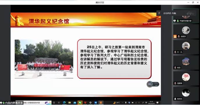 活动伊始,向晶回顾了渭南、铜川的红色基地研习之旅,详细介绍了相关历史,给大家上了一堂生动的党课。她表示,渭南和铜川革命纪念馆展现了陕西人民在党的领导下,不屈不挠、奋起抗争、艰苦卓绝的革命斗争场面,践行了“坚定信念、听党指挥、不怕牺牲、矢志奋斗”的革命精神。党史是一部艰辛的奋斗史,新时代青年要从历史中体悟伟大精神,从红色精神中汲取营养,指导实际行动,在实践中尽心竭力为人民服务,为实现中华民族伟大复兴注入强大动力。