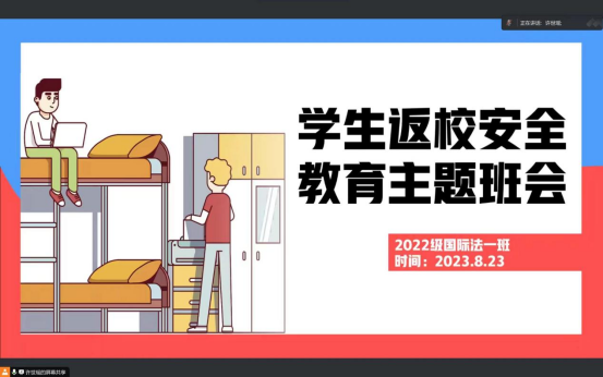 为切实做好秋季学生返校工作,增强学生安全防范意识,提高自我保护能力。8月23日,国际法学院各年级以线上会议形式组织召开了返校安全教育主题班会。