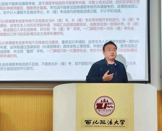 活动中,苏芝双老师向大家介绍了校内课程考核的制度、留级制度、毕业与学位制度等,并提醒大家要注意宿舍文明秩序。苏老师用生动的例子提醒并警示同学们,在未来的生活中一定要遵守校规校纪,严格按照西北政法大学有关规定要求自己,端正自己的行为和态度,防患于未然。同时苏芝双老师也提醒同学们,考上大学并不意味着结束,大家仍然要不断努力,在四年大学生活期间打好基础。