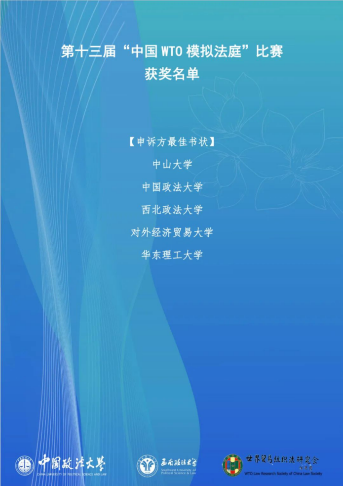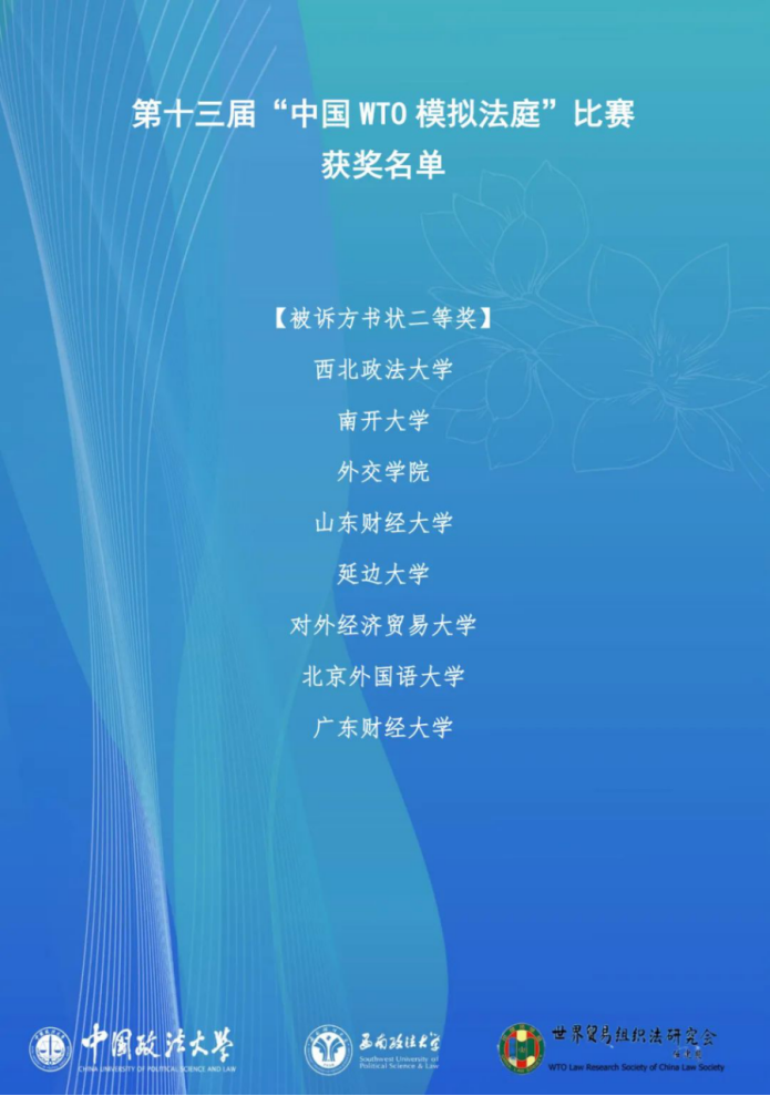 2024年12月8日,第十三届“中国WTO模拟法庭”比赛在北京落下帷幕。经过激烈角逐,西北政法大学代表队荣获全国二等奖、申诉方最佳书状奖、被申诉方书状二等奖。