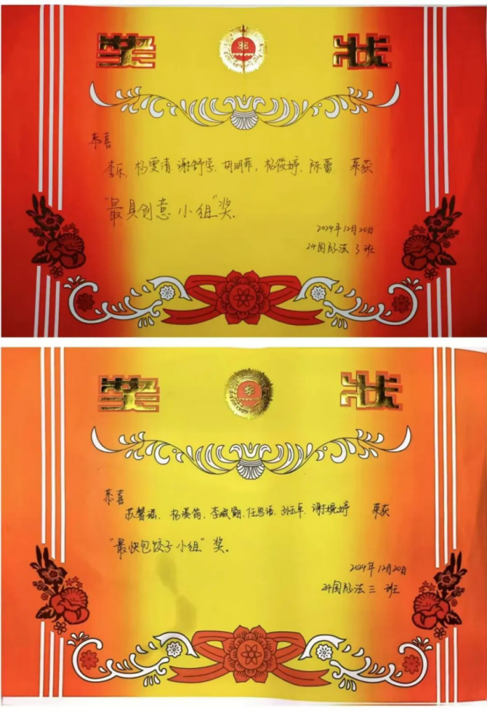 在包饺子的环节中,苏馨瑶、杨溪筠、李峸翧、任思语、谢婉婷、孙玉卓小组荣获最快包饺子小组称号,杨雯清、胡明菲、杨筱婷、谢舒学、李乐、陈蕾小组荣获最佳创意饺子小组称号,黄思齐为获奖同学颁奖。