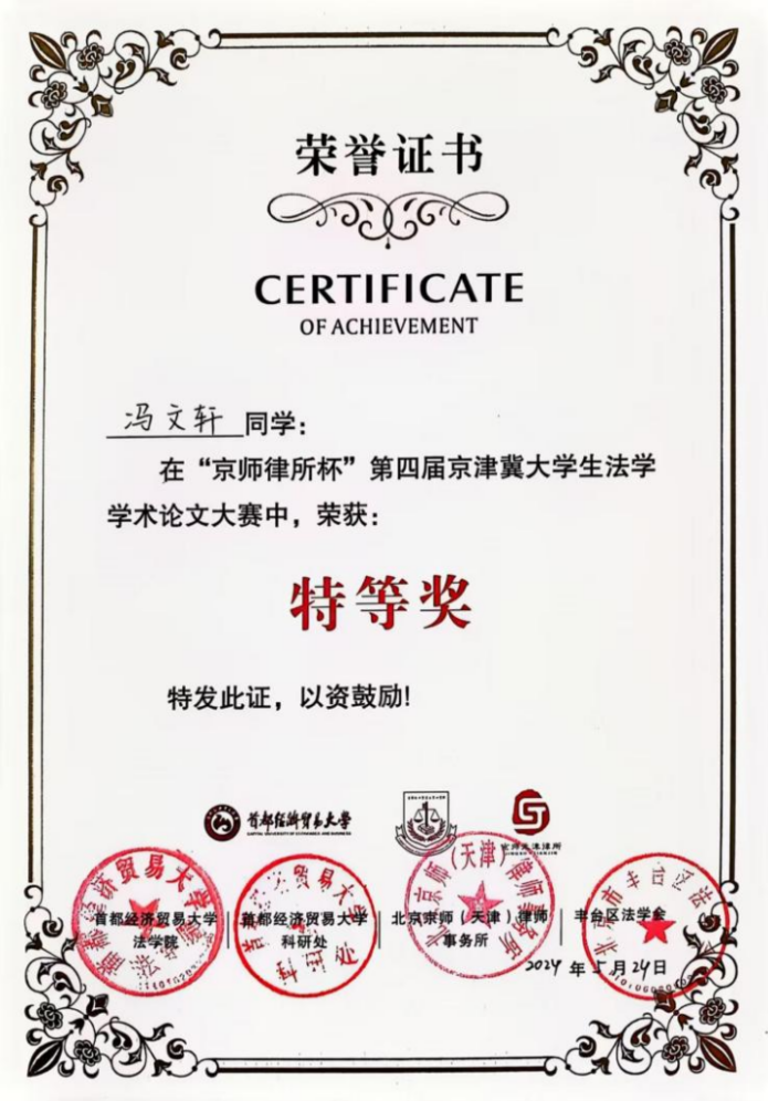 2、“京师律所杯”第四届京津冀大学生法学学术论文大赛特等奖