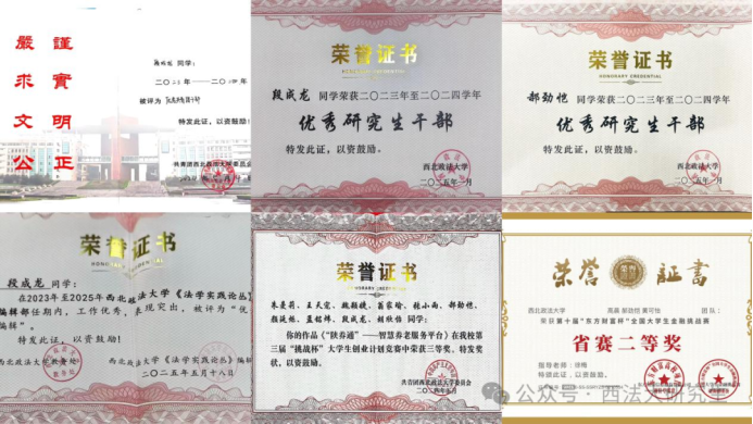 获得荣誉:研究生一等学业奖学金、优秀研究生干部、优秀共青团干部、全国大学生英语翻译大赛国家级三等奖、第十四届全国大学生三创挑战赛校级特等奖、第三届“挑战杯”竞赛校级三等奖、《法学实践论丛》优秀编辑