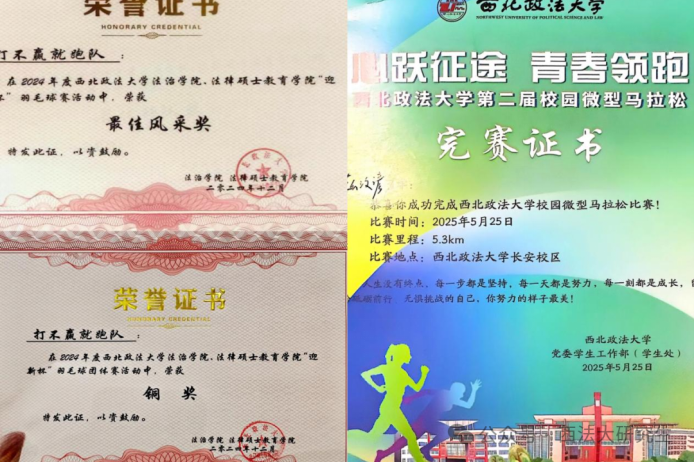 靳汶谚同学不仅在“迎新杯”羽毛球比赛中摘得铜奖,而且在西北政法大学第二届微型马拉松比赛中顺利完赛;杨泽言同学在“陕公杯”篮球赛中获得第四名的成绩。段成龙和郝劲凯同学在课余时间也积极健身、游泳以及跑步。宿舍定期组织爬山和羽毛球比赛等团建活动,形成了互助友爱、温馨和谐的集体氛围。