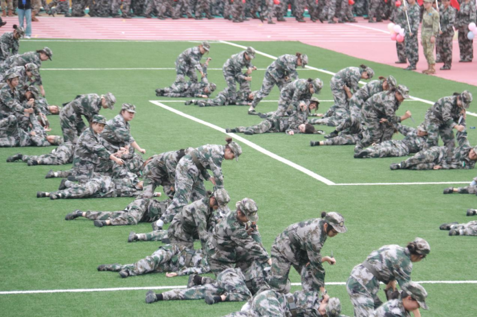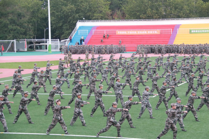 在军体拳表演中,参训学员组成的表演方阵迅速列队,随着指令响起,“哈!”的呐喊声整齐响亮,回荡在田径场上空。出拳迅猛如疾风,踢腿有力似惊雷,格挡、冲拳、扫腿等动作连贯流畅,一招一式都饱含力量与决心,充分展现出新生们不畏艰难、奋勇拼搏的精神风貌。他们动作整齐划一,气势如虹,将军体拳的阳刚之美与纪律之严展现得淋漓尽致,赢得现场阵阵掌声,也让在场师生感受到新时代青年的热血。