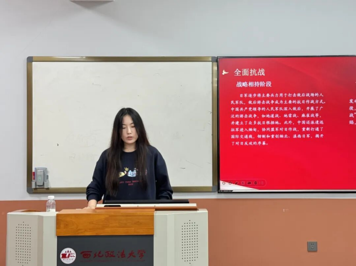 活动伊始,胡明菲以“铭记烽火家国恨,传承铁血中华魂”为题,带领同学们回顾了中国人民抗日战争的壮阔历程,重点阐释了中国共产党在抗战中的中流砥柱作用以及全民族抗战的重要历史意义。她结合影像资料与英雄事迹,为同学们深刻解读了伟大抗战精神的丰富内涵与时代价值,希望大家主动将个人发展融入强国复兴的伟业中,以“挺膺担当”的姿态走好新时代的长征路。