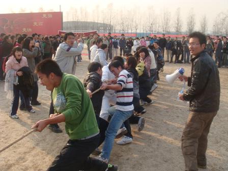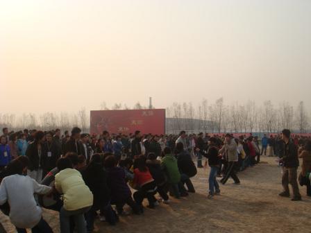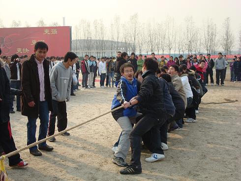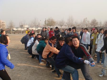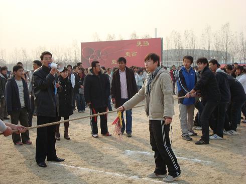 下午三点,拔河比赛准时开始。07级与08级的同学共同参加了此次比赛。比赛采取三局两胜式淘汰赛制,小组赛由十二进六和六进三两轮组成,对阵场次由抽签决定,小组赛最终胜出的三个班级进行最终的角逐,产生冠亚季军。随着比赛哨声的吹响,整个赛场也立刻沸腾。每位同学都拼劲全力,为了班级荣誉而战。第一场比赛在08级五班与08级三班之间进行,场下的观众热情高涨,在呐喊声中比赛一次又一次达到高潮,最后五班取得了比赛的胜利。而后,比赛一轮一轮顺利的进行下去。接着最后一场扣人心弦的比赛开始拉开帷幕,冠亚军即将在08级四班与07级二班之间产生,这是一场新生与老生之间的友谊较量,场上的气氛也趋于白热化。最后07级二班凭借着丰富的经验成功卫冕,08级四班,07级六班分获亚季军。