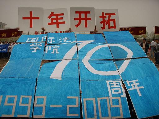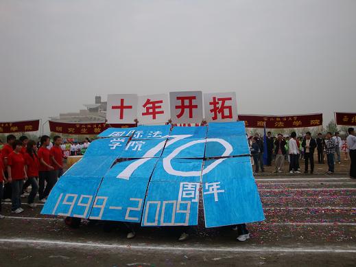 代表团方阵步伐整齐的进入了操场,08级同学们动作有力,口号洪亮,精神饱满。经过主席台时,方阵中穿着红白上衣的同学突然左转面向主席台,并开始依次翻动手中纸板,顿时两行醒目大字映入眼帘“中国崛起•十年开拓”,展示了“建国六十周年•与国同庆”“建院十周年•铸造辉煌”的主题。年轻而有朝气的国际法人,用他们新颖别致的创意,祝福着西法大,祝福着英超直播线上看