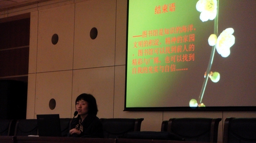 首先,王老师向我们介绍了我校南,北校区两座图书馆分布的相关信息。紧接着,利用多媒体向新生介绍了图书馆的定义及类型,并且通过详尽的讲解和大量的网站图片展示,生动介绍了图书类型的具体检索和借阅的程序及相关注意事项。然后向新生介绍了图书馆的读者服务类型,最后,以话语激励我们充分利用图书馆丰富资源努力学习。