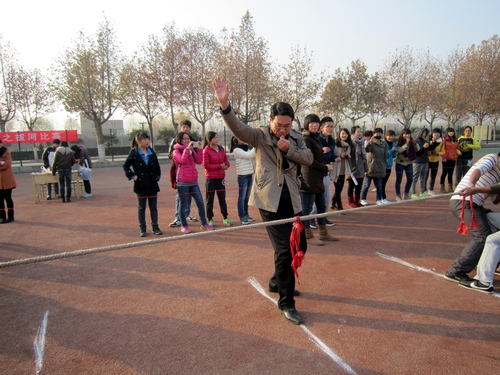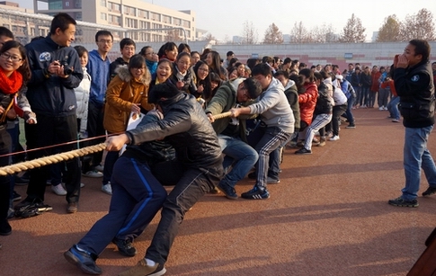 越野赛后为拔河比赛,大一大二共十三个班级组成十三支队伍参加比赛。比赛采取三局两胜制,取前四名进行奖励。尽管当天天气寒冷,但是参赛队伍表现出了极高的团结拼搏精神,他们劲往一处使,拉拉队高声呐喊,比赛气氛十分热烈。最终2012级7班捧得“大力杯”,蝉联两届冠军,2012级4班获得第二名,2013级4班获得第三名。