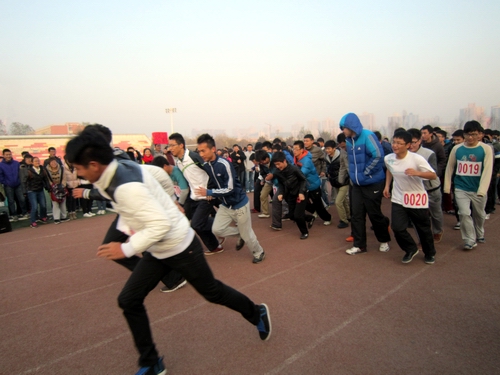 趣味运动会第一个项目是越野赛。男生越野赛程为4.5公里,女生为3公里。比赛线路沿线设有监督点以防突发情况发生,比赛按选手所用时间长短来确定名次。男女生共有210人参加了这次越野赛。最终男子组李春辉同学取得了第一名,女子组王婷同学夺冠。