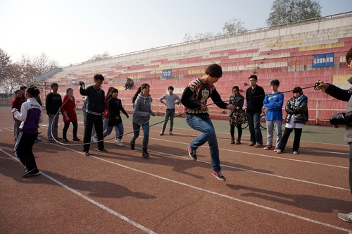 本届运动会的第三个项目为跳大绳下饺子,比赛时,以发8分钟为限,计算通过大绳的人数,按最终人数确定名次。在比赛中,大绳均匀摇起来,运动员们以轻盈的步伐依次跃入,激烈而紧张的比赛充斥于大绳摇起的每个瞬间。最后2012级4班夺得冠军,2012级5班获得第二名。