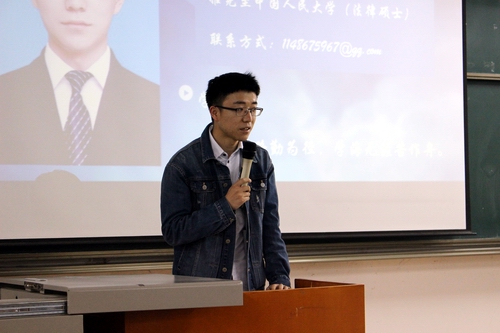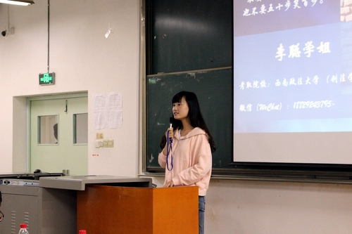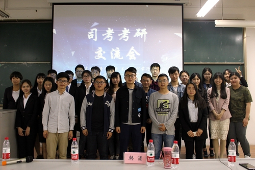 交流会伊始,保研至中国人民大学的杨晨学长分享保研之路的经验以及学习的方法,告诉我们要积极参与院校活动。吴彬彬学姐、李聪学姐和考取西北政法大学刑法学专业硕士研究生的周婉意学姐分享考研英语的复习方法。考取中山大学的郭伟学长和考取四川大学的滕佳学长交流考研心得,现场气氛很活跃,同学们对学长学姐提出了自己对考研之路的疑惑,学长学姐们一一认真作答。大会过半,韩潇老师对本次活动本质意义做了深刻的阐释,分析了考研形势,国内各大高校招生变化以及就业压力,让我们端正态度,密切关注考研信息以及就业信息。接下来,司法考试高分通过的许还辉学长和最后出场的被英国爱丁堡大学录取的吕子祎学姐分享了他们学习的方式,提醒我们要注意心态问题。