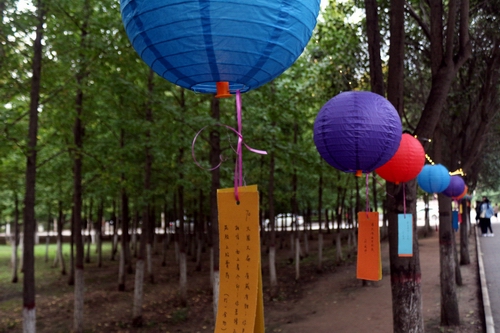 作为中国独有的富有民族风格的一种文娱形式,猜灯谜更是不可缺失的活动。小径曲幽、彩灯高悬,写满灯谜的卡片被大家交换浏览。同学们争相答题,十分热闹。