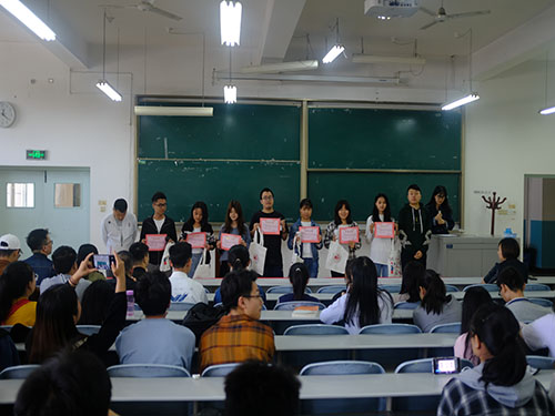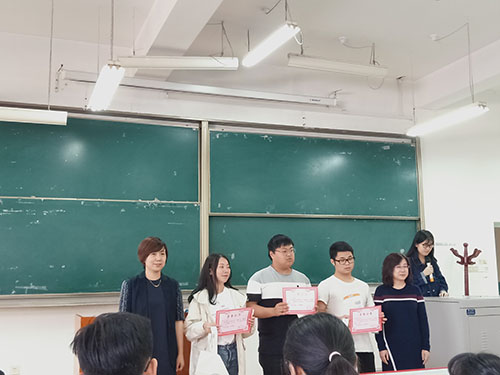 在同学们热烈的掌声中,由韩潇老师和徐秉鹏老师为第四名到第十名同学颁发奖状和奖品,由英超直播线上看 党委副书记、副院长王聪老师、秦音老师为第一名到第三名同学颁发奖状和奖品。老师与获奖同学合影留念。