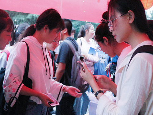 作为中国独有的民族风文娱活动,猜灯谜更是不可或缺的部分。小径通幽、彩灯高悬,写满灯谜的卡片被大家交换浏览。同学们争相答题,十分热闹。