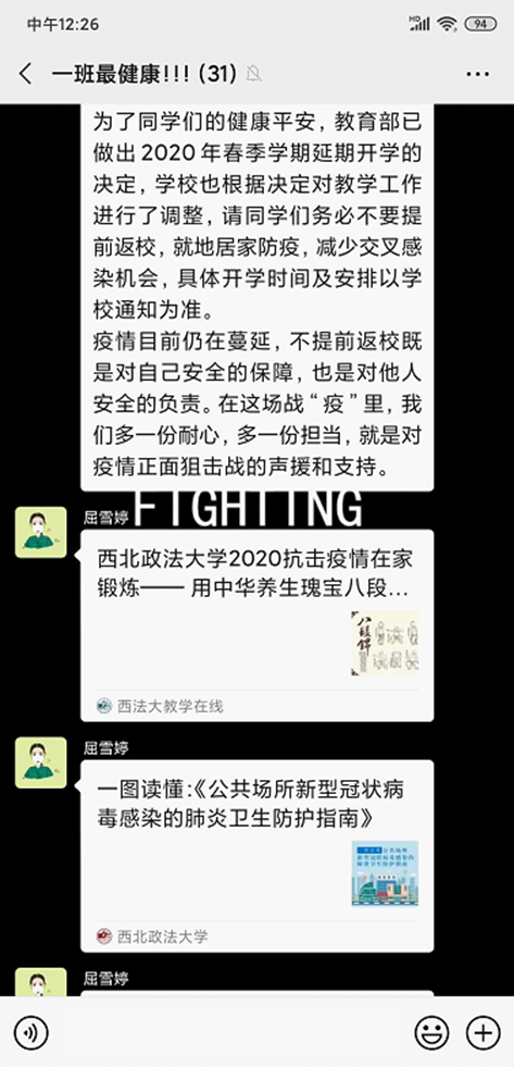 “学生健康信息统计”既是陕西省有关部门的重要决策部署,也是疫情防护的必要举措。疫情防控关键时期,希望同学们按要求每天中午12:00之前填写“我在校园”发布的“西北政法大学疫情防控工作学生信息登记表”。非常时期,望同学们强化纪律观念,按时、规范填写问卷,三次不按时提交者全院通报。
