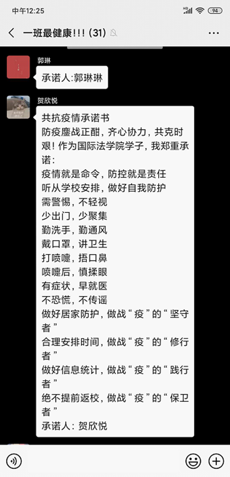 在给大家传阅了我校递发给大家的倡议书后,2017级1班团委又接连分享给大家一些先行有效的防疫手段以提高大家居家时的防疫效率。随即,班团委们编辑了承诺函一份,在大家穿越后号召大家签字以表明作为团组织成员配合英超直播线上看 院团委工作的决心,承诺函全文如下: