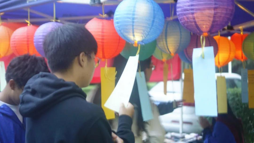 “一岁一中秋,岁岁人不同”,中秋赏月猜灯谜,是中华民族历史悠久的传统文化之一。彩灯高悬,写满灯谜的卡片被大家交换浏览。同学们争相答题,热闹非凡。