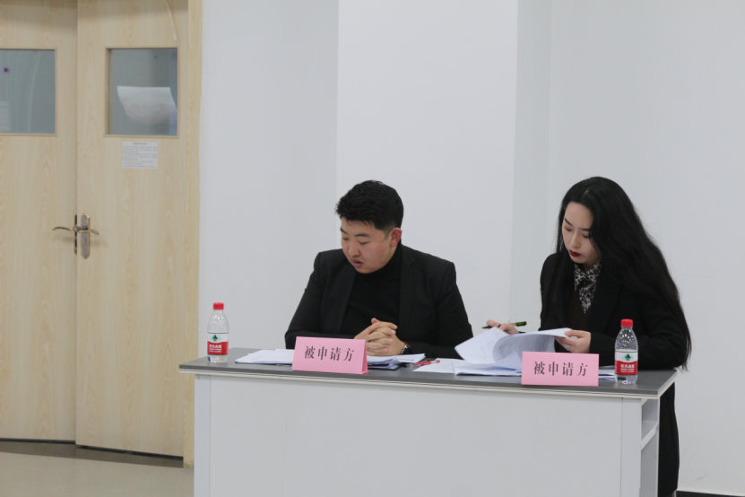 在第二赛场上,西安财经大学法学院代表队与西北政法大学经济法学院代表队分别作为申请方与被申请方就相关案件开展模拟仲裁庭竞赛。庭审中,申请人与被申请人从法条和相关实际情况互相问答、逐个击破。而后面对仲裁员的提问,双方队员临危不惧,有条不紊地进行回答。