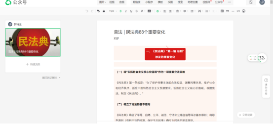 由于疫情影响,朱天意同学以本次民法典的八十八个重要变化为落脚点,通过线上公众号进行推广。考虑到线上宣传不受到时间空间的限制,受众面广,方便施行,同时能够发挥自己在学生会所学技能,朱天意同学以推送形式进行了此次民法典宣传。该推送浏览量500余次,取得了良好的宣传效果。