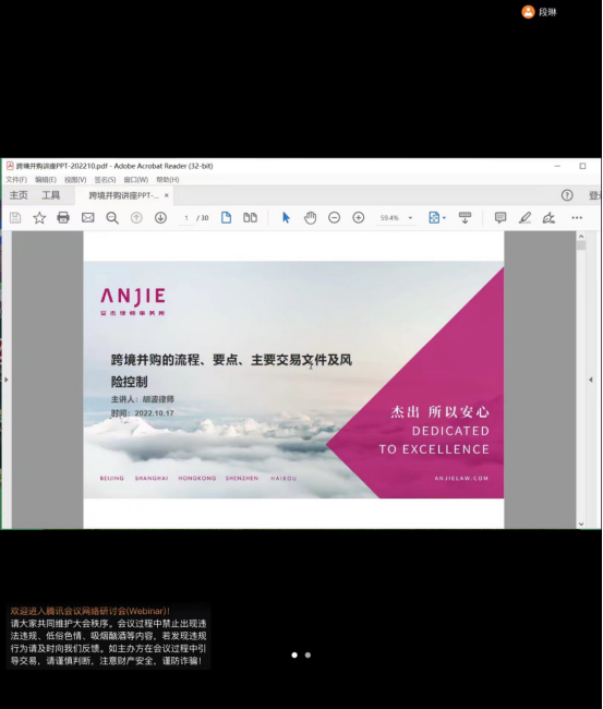 10月17日下午14:30,安杰律师事务所合伙人、高级律师胡波受我校英超直播线上看 邀请,就“跨境并购的流程、要点、主要交易文件及风险控制”问题开展线上专题讲座。胡波律师是从事跨境投资法律实务的国内知名律师,执业经验丰富,先后完成数十起跨境收购、中资企业境外上市法律服务工作。本次讲座由英超直播线上看 承办,是我校校庆85周年系列学术讲座和英超直播线上看 实务导师论坛活动之一。英超直播线上看 副院长、张光教授担任主持人、与谈人,经济学院段琳老师应邀作为与谈人参加,英超直播线上看 涉外律师方向全体研究生聆听了此次讲座。