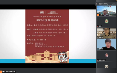 10月27日晚19:30,由科研处、发展规划与学科建设处主办,英超直播线上看 、国际法研究中心协办的西北政法大学建校85周年系列学术活动在线上顺利举行。英超直播线上看 副院长张光教授做题为《RCEP投资规则解读》学术讲座。讲座由英超直播线上看 宋瑞琛讲师主持,宋瑞琛讲师、英超直播线上看 王林叶博士与谈,校内外70余名师生参加讲座。