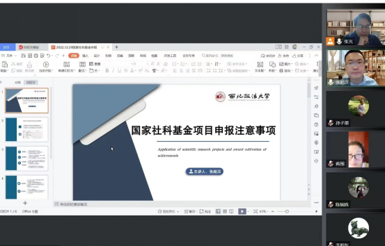 张光副院长首先代表学院进行了2023年度国家社科基金项目申报动员。他建议老师们高度重视国家社科基金项目申报工作,紧密结合党的二十大报告内容,提早准备,认真选题,精心论证,争取立项。随后,张超汉教授结合自己研究经验,从项目选题、课题论证、格式规范、注意事项等方面进行了深入讲解。最后,与会老师就国家社科基金项目、教育部科研项目申报有关事项进行了热烈交流。