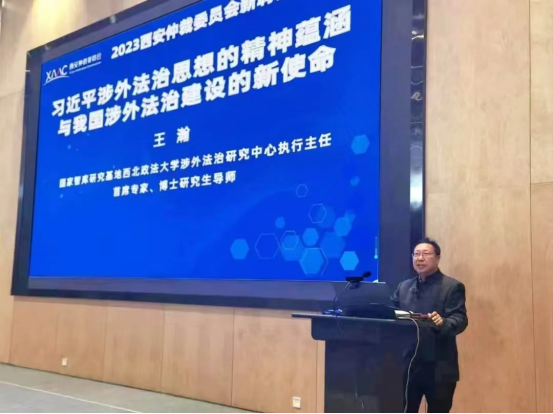 2023年3月24日,西安仲裁委员会在一带一路国际商事法律服务示范区西仲新址报告厅,举行2023年新聘仲裁员培训会议,此次专场培训通过现场培训和视频会议同步进行。西安仲裁委员会副主任兼秘书长徐文新主持开班仪式,西安仲裁委员会主任李洪涛做培训动员报告。我校国际法学科带头人、国际法研究中心主任、国家级智库基地西北政法大学涉外法治研究中心执行主任、首席专家王瀚教授应邀出席开班仪式。在首场培训讲座中,王瀚教授做了“习近平涉外法治思想的精神蕴含与我国涉外法治建设的新使命”的专题讲座,就涉外法治的内涵和作用、习近平涉外法治思想的核心要义和新时代我国涉外法治建设的布局和使命等问题与新聘仲裁员进行讲述和交流。