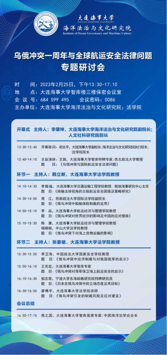 2023年2月25日,大连海事大学海洋法治与文化研究院和大连海事大学法学院共同举办“乌俄冲突一周年与全球航运安全法律问题”研讨会,原联合国国际海洋法庭法官、中国海洋法学会会长、大连海事大学海洋法治与文化研究院首席智库专家高之国教授、大连海事大学党委书记郑少南教授、大连海事大学副校长初北平教授,西北政法大学航空法治现代化协同创新中心主任、首席专家、大连海事大学海洋法治与文化研究院特聘研究员王瀚教授,大连海事大学交通运输工程学院和极地海事研究中心主任李振福教授、西南政法大学英超直播线上看 副院长周江教授、大连海事大学法学院副院长韩立新教授、张晏瑲教授、中国政法大学国家安全学院李卫海教授、宁波大学东海战略研究院特聘研究员郁志荣、大连海事大学特聘智库研究员王克宏等专家学者出席研讨会议。大连海事大学人文社科研究院院长、海洋法治与文化研究院副院长李肇坤教授主持开幕式,大连海事大学党委书记、大连海事大学海洋法治与文化研究院院长郑少南、中国海洋法学会会长高之国,大连海事大学副校长、法学院院长初北平分别致辞。