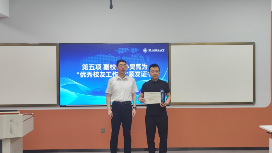 孙昊亮为“优秀校友工作者”万商天勤律师事务所主任卫永鹏和陕西秦石律师事务所主任田磊颁发证书。