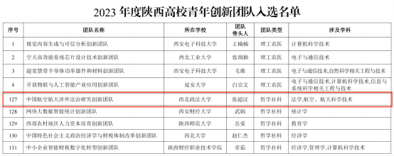 8月29日,陕西省教育厅公布了2023年度陕西高校青年创新团队名单,由我校张超汉教授领衔的“中国航空航天涉外法治研究创新团队”成功入选,这也是陕西省首个以国际法学科获批的高校青年创新团队。