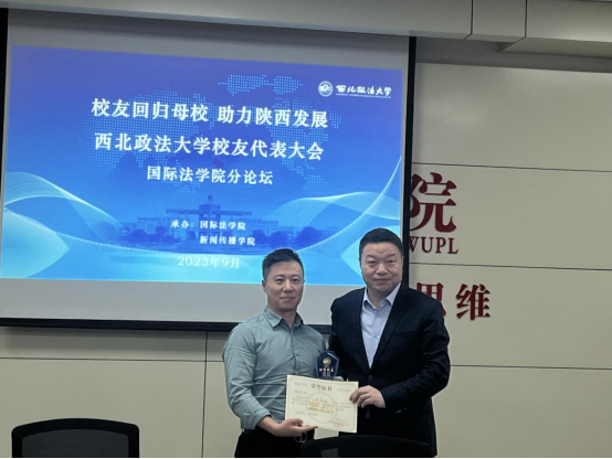 刘亚军向北京方圆众合教育科技有限公司总裁、英超直播线上看 99级校友李曰龙颁发“西北政法大学优秀校友”证书。