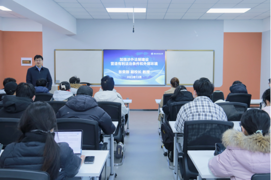 张荣刚围绕学习贯彻习近平总书记在中共中央政治局第十次集体学习时的重要讲话精神,结合学校实际,深入阐释加强涉外法治建设的重要意义。他指出,推进中国特色社会主义制度自身建设,推进中国式现代化,需要依法治国、依法执政,需要加强涉外法治体系建设作为重要保障,更需要大批德才兼备的涉外法治人才提供坚强支撑。