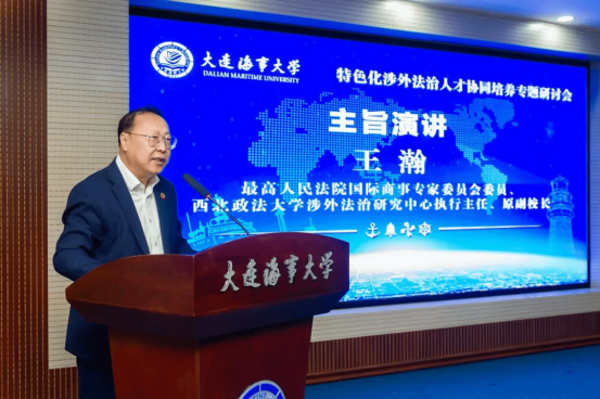 主旨演讲环节,最高人民法院国际商事专家委员会委员、西北政法大学涉外法治研究中心执行主任、原副校长王瀚教授作题为《从战略高度认知涉外法治人才队伍建设和涉外法治人才培养战略性和紧迫性》的演讲。
