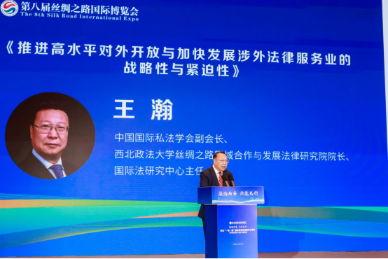 开幕式后,大会进行了西安一带一路国际商事法律服务示范区涉外法治建设法律实务论坛。王瀚教授应邀做了《推进高水平对外开放与加快发展涉外法律服务业的战略性和紧迫性》的主题演讲,分别就涉外法律服务对高水平对外开放的支撑和保障、中国涉外法律服务业面临的机遇和挑战、中国法律服务业发展的国际转型与机制创新三个问题进行了深入阐释和评析。