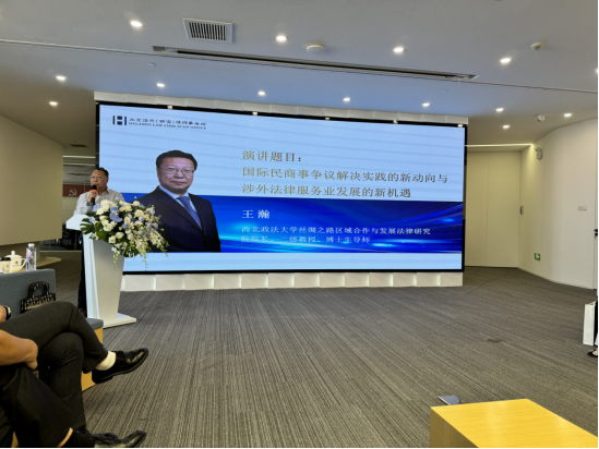 在主旨演讲环节,王瀚教授应邀做了“国际民商事争议解决实践的新动向与涉外法律服务发展业的新机遇”主题发言,就“全球化经济一体化发展进程与国际商事争议解决机制的实践深度融合”等国际争议解决领域的前沿内容,展开了详实而精彩阐释。