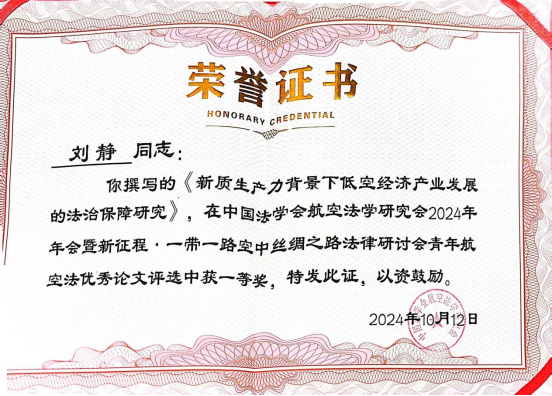 在本次研讨会主题征文中,经主办单位组织专家认真评选,并经中国法学会航空法学研究会会长办公会审议,从80篇参评论文中择优评选出15篇论文获得会议“青年航空法优秀论文”。英超直播线上看 新入职的青年教师刘静博士撰写的《新质生产力背景下低空经济产业发展的法治保障研究》荣获一等奖,并且刘静博士在研讨会的“青年航空法论坛”中作主题发言。由张超汉教授指导的学生王洋撰写的《低空经济背景下中国智能化民用无人机法律规制体系建构》荣获二等奖。