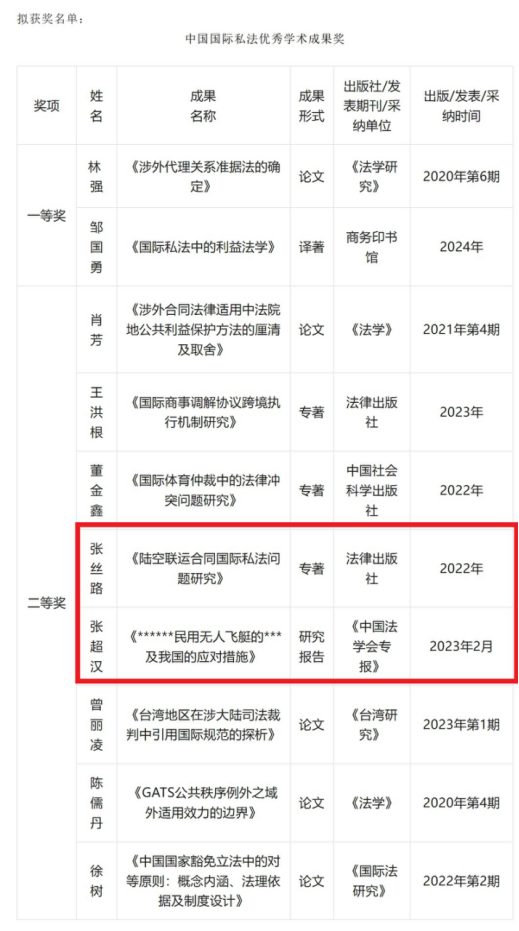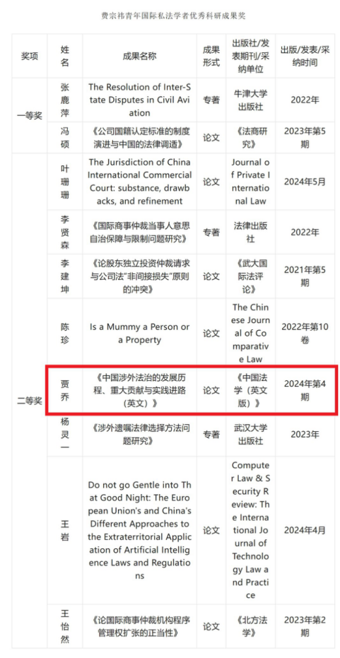 “中国国际私法优秀学术成果奖”“费宗祎青年国际私法学者优秀科研成果奖”是中国国际私法学会为提升国际私法研究的质量和水平,推动和促进我国国际私法学的可持续发展所设立的奖项。该奖项是中国国际私法学界对国际私法学者所设最高奖项,旨在表彰具有重大理论价值和实践意义的原创性科研成果。2024年经评审确定“中国国际私法优秀学术成果奖”作品10件,其中一等奖2项,二等奖8项;“费宗祎青年国际私法学者优秀科研成果奖”作品10件,其中一等奖2项,二等奖8项。