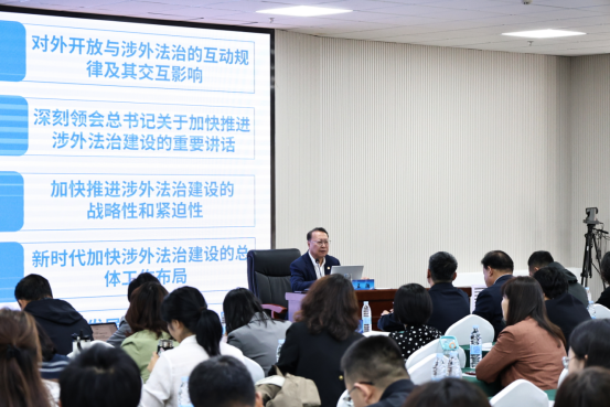 我校国家智库研究基地涉外法治研究中心执行主任、首席专家、博士生导师王瀚教授应邀做《推进高水平对外开放与加快涉外法治建设的战略性和紧迫性》的专题讲座,分别就对外开放与涉外法治的互动规律及其交互影响、深刻领会总书记关于加快推进涉外法治建设的重要讲话、加快推进涉外法治建设的战略性和紧迫性、新时代加快涉外法治建设的总体工作布局和新时代发展我国涉外法律服务业的政策措施与顶层设计等五个问题做了深入细致的阐述。