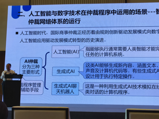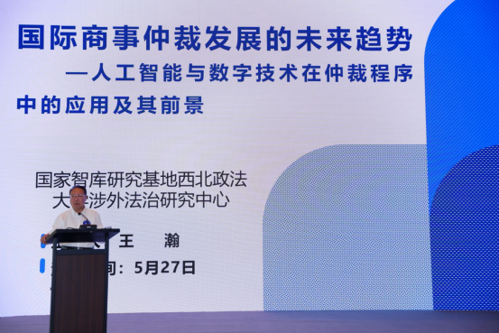 西安交通大学法学院副院长李万强教授主持主旨发言,我校王瀚教授、香港国际仲裁中心秘书长刘煦婷、西安仲裁委员会副主任兼西安仲裁院院长徐文新分别作主旨演讲。王瀚教授发表了“国际商事仲裁发展的未来趋势——人工智能与数字技术在仲裁程序中的应用与前景”的主题演讲,就“人工智能和数字技术在国际仲裁程序运用的政策导向”、“人工智能和数字技术在仲裁程序中运用的场景—仲裁网络体系的运行”和“人工智能和数字技术在仲裁程序中运用的趋势与风险控制”三个问题进行深入阐释。